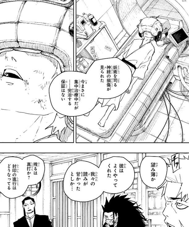 一方、ハクリの容態は会話について報告できるくらいには肉体的に良好…、だそうですが、妖術を司る神経が損傷しているようで、転送を使って毘灼から妖刀を奪う作戦の続行は難しそうです。完治する保証はない、とも言っているので、今後作戦が再開できるかも怪しそうです。真打の封印は順調で5分の3くらい進んでいるそうですが、ハクリの転送が断たれた今、上層部は真打を使う事も想定しようとします。しかし、座村が使った梟は日本全土に展開されているようで、日本全てで妖刀を探知出来る妖刀探知機となっているようです。下手に使うと座村や毘灼に真打の場所を知られてしまいそうです。
