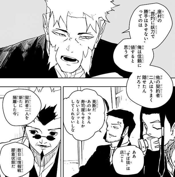 上層部は座村の“毘灼に妖刀で勝手はさせない”と言った言葉を信じていて、他の契約者二人はうまく隠せたようです。数日は情報戦で膠着状態となりそうなので、上層部はこの間は毘灼と座村が互いに精神をすり減らしてくれることを期待し、やはり真打は使用しない事を決めます。