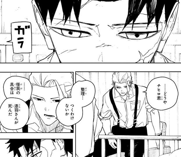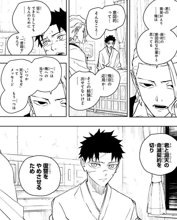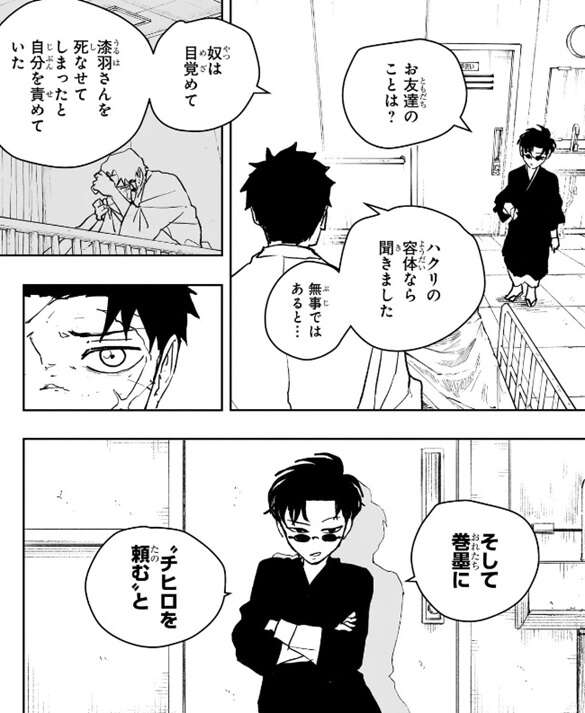 柴はチヒロの黄泉がえりは座村の意図的な仕業だと思っていると言い、飛宗の応用かどうかは結論を出せていないが、一つは俺への当てつけ“いつか死なせるぞ”ってメッセージ、だとチヒロに話します。さらにもう一つはチヒロと淵天の命滅契約を切り、復讐を止めさせるため、だとチヒロに言います。柴は過去に六平国重を守れず死なせてしまったので、柴へのメッセージは座村からの当てつけで、チヒロから、当てつけを見事に喰らったわけですか、と言われてしまいます。柴も、…俺は守れへん、2回目や、とつぶやきます。チヒロは柴に、漆羽が殺されないといけない理由、国重達が隠した“罪”を柴に聞こうとしますが、病室に意外な人物が入ってきます。
