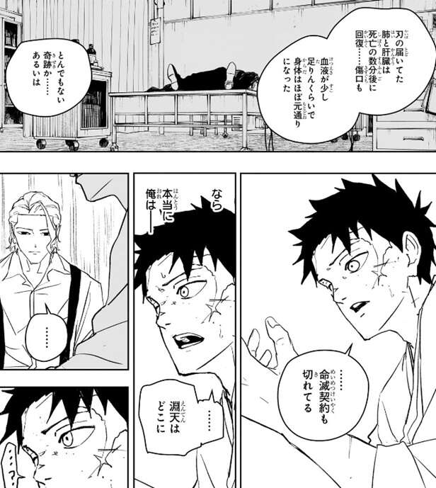 座村によって漆羽が殺され、自分も斬られて死にかけたとチヒロは柴に話しますが、柴はチヒロが明確に一度死亡したと言います。刃の届いていた肺と肝臓は何故か、死亡の数分後に回復して傷口も血液が少し足らないくらいで身体はほぼ元通りになり、とんでもない奇跡か……、あるいは、と柴はつぶやきます。ここでチヒロは淵天との命滅契約が切れている事に気付き、淵天がどこにあるか柴に聞きます。