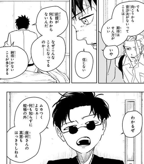 管轄外の人間の関与は基本的に認められないのですが、特例という事で漆羽の死体を確認したいと交渉中のようですが、柴は向こうから音沙汰がないので期待しない方がいいと言いますが、チヒロは信じないと言います。前提が何も分からずチヒロは納得いかない事が多すぎると言いますが、巻墨の隊長もわかるぜとチヒロに同意します。巻墨も座村に何も知らされず蚊帳の外で隊長もムカついていて、座村の真意もはっきりしない、子ども扱いしやがって、と怒っています。