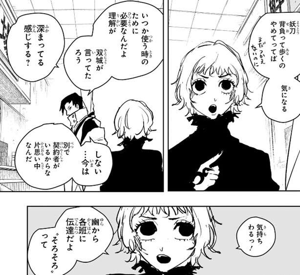 久々李と呼ばれた人物が背負っている物は妖刀でしたが、もう一人の毘灼のメンバーは妖刀を背負って歩くのを止めるように注意します。双城がいつか使う時のために理解が必要と言っていたので、久々李は妖刀を背負っているようですが、理解は深まっていないようで、別に契約者がいるので今は片思い中だと久々李は言います。それを聞いて毘灼のメンバーは、気持ちわるっ!とつぶやき、幽から各班に“そろそろ”と伝達が来たことを伝えます。久々李は昼彦のせいで面倒な…、とつぶやき、昼彦は作戦も殺しも雑だ、甘やかしすぎだよ、幽は、と言います。しかし幽や昼彦達が身動きが取れず、さらに昼彦は妖刀も触れずリハビリ中と聞くと、久々李はカワイソと昼彦に同情します。