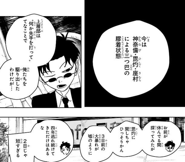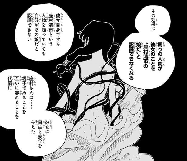 巻墨の隊長はチヒロに奥の手があると言いますが、ここで場面が神奈備の上層部に移り、上層部の一人が座村の唯一の弱点と言えるものが一つある、と話しています。それが座村の娘だそうで、上層部は座村の娘を人質として使いたかったようです。