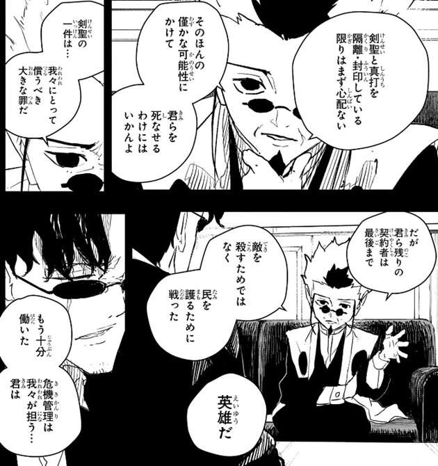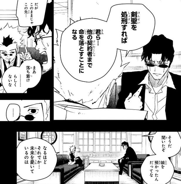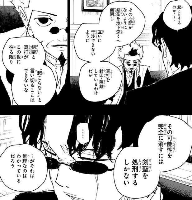 剣聖を処分すれば他の契約者まで命を落とすことになる、と上層部の一人は言いますが、座村はそれでも災厄が再び起こる事を心配します。ここで上層部の一人は娘を預かったんだってな、と座村に言いそれで未来を憂いているのかと納得します。