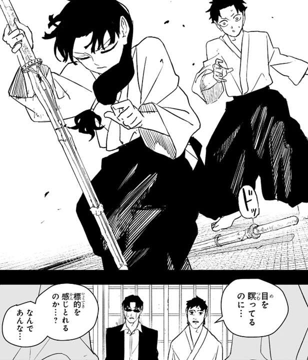 座村が上層部の話に納得したかは不明ですが、神奈備本部を後にして居合白禊流の道場に行くと、イヲリが目を瞑って稽古をしています。目を瞑ったままなのに標的を感じられるようで、相手の竹刀を叩き落していますが、なんで標的を感じ取れるのか?と、道場の大人も驚いています。