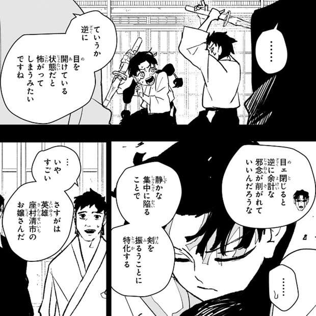座村は、ずーっと自分の真似をして慣れてしまったんだろう推測、逆にイヲリは目を開けていると竹刀を怖がってしまい、涙目になってしまっています。目を閉じると逆に余計な邪念が削がれて、静かな集中に陥ることで剣を振ることに特化する、と座村は言い、道場の大人も、さすがは英雄座村清市のお嬢さんだ、とイヲリを称賛します。