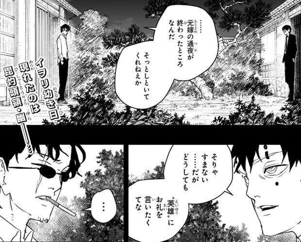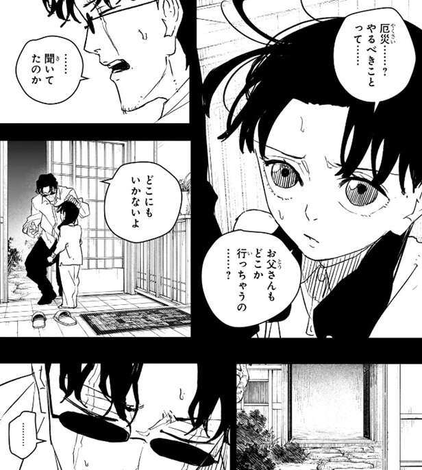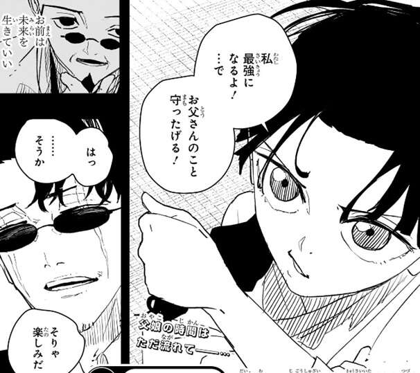 イヲリは座村に話しかけると、私最強になるよ!…でお父さんのこと守ったげる!と、得意げに話し、お前は未来を生きていいという上層部の一人が言った事を思い出しながら、座村は、そりゃ楽しみだ、と娘の言葉を喜びます。
