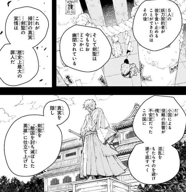 五人の妖刀契約者がその後、剣聖を食い止めてどこかに幽閉したそうですが、幽はこれが掃討の真実で、剣聖の実情は歴史上最大の罪人だと言います。しかし小国の侵略の影響が残り不安定だったこの国を建て直すべく、真実を隠し剣聖を“敵国を討ち滅ぼした英雄”に仕立て上げたそうです。幽は責める気はない、ここからが本題で予言を授かったんだ、と座村に言います。