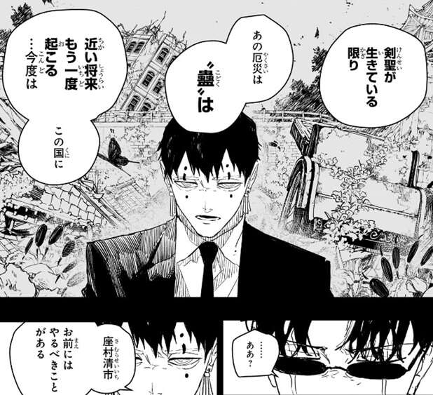 その予言とは、剣聖が生きている限りあの災厄・蠱は近い将来もう一度、今度はこの国で起こるというもので、幽は座村に、未来のためにお前にはやるべきことがある、と言います。ここでイヲリが座村と幽の会話に気付き、玄関を開けようとすると、幽は妖術で姿を消します。