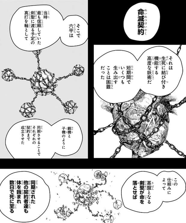 六平国重が妖刀に施した命滅契約は生死に結び付き機能する高度な妖術のようで、短期間にいくつも生み出すのは困難だったようです。そこで六平は、当時最も信頼していた剣聖に渡す予定の真打を軸として、親機と子機の様に同期させることでそれぞれの契約まで成立させたそうです。しかし、この仕組みによって基盤となる剣聖が命を落とせば、同期された他の契約者達も体を蝕まれ数日で死んでしまうデメリットがあるそうです。当時は玉将である剣聖との一蓮托生、戦に臨むにあたっての妖刀契約者の覚悟の表明のようなものだったようですが、剣聖が乱心した今となっては仇となってしまいました。