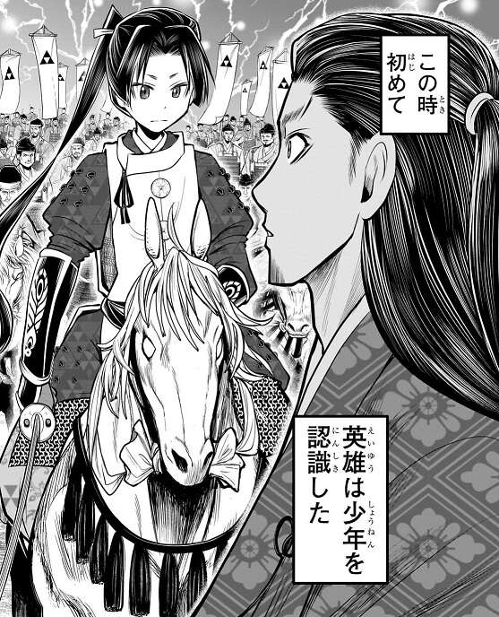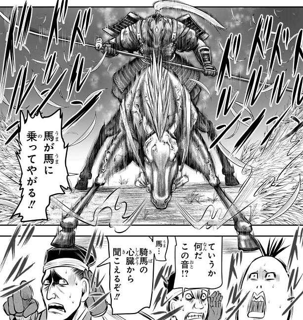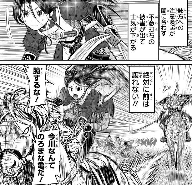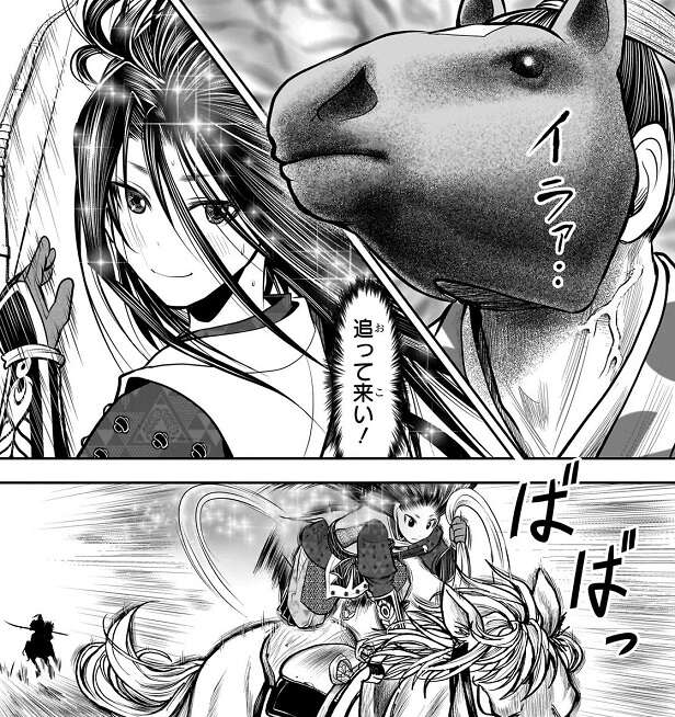 今川の前を時行が常に騎乗して挑発し続けるという作戦は功を奏し、北条軍の士気は上がり続けます。今川と時行の競馬は戦場中の兵を魅了し、次第に戦場は北条軍に有利となっていきます。さらに、玄蕃の破壊工作で今川は騎乗する馬の替えを失ってしまいます。
