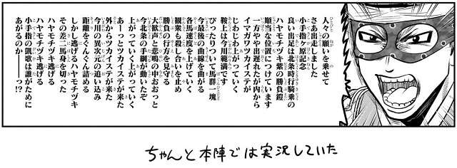 競馬という形で第88話は、時行と今川範満は馬で競い合っていましたが、本陣付近ではちゃんと競馬実況もしていたそうです。競馬実況もあれば、北条軍は士気も大分上がったでしょう。