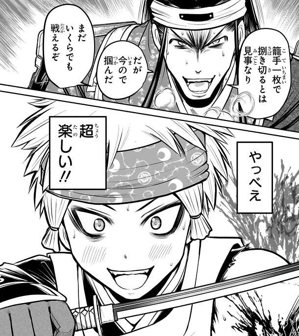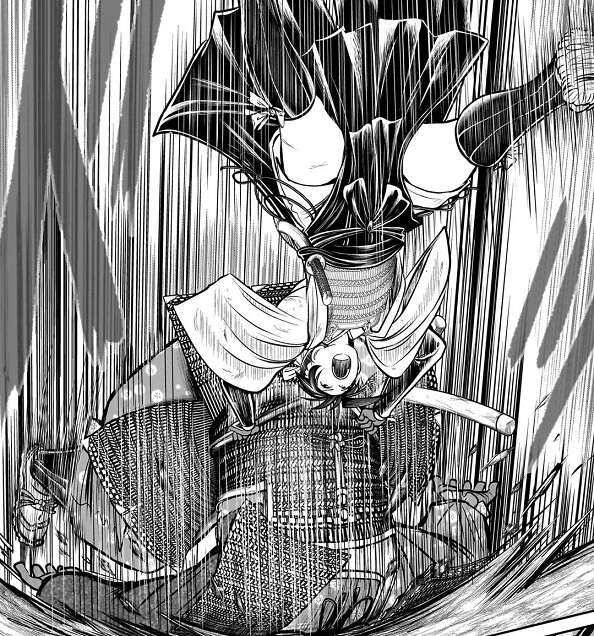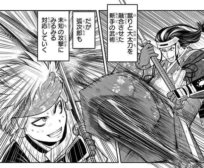 岩松経家の猛攻を雫、吹雪で止めつつ望月が岩松に止めを刺し、北条軍の後方の陣を襲おうとしてた岩松の関東庇番衆2番組を倒す事に成功します。一方、渋川と一騎打ちの戦いをしている弧次郎は、一進一退の攻防を繰り広げていました。渋川が蹴りと大太刀を融合させた新手の武術を繰り出すと、弧次郎も未知の攻撃にみるみる対応していきます。