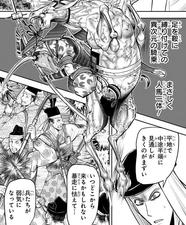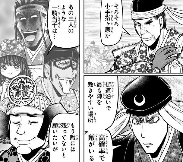 小手指ヶ原の会戦では、北条軍が到着した途端にいきなり一斉突撃を仕掛けてきます。両軍入り乱れる混戦となる中、異常な馬の面を被った今川範満が突然現れ、時行を強襲します。今川は、そのまま時行を襲い続けると思われましたが、時行を無視して別の敵に襲い掛かり、騎馬で縦横無尽に戦場を駆け抜けていきます。