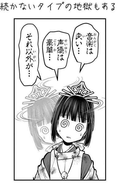 第109話で頼重から未来を見通す力を引き継いで未来を見ることが出来るようになりましたが、素材、周回、課金を繰り返す無間地獄が永遠に続く未来が見えたようです。あまり役に立ちそうにない未来の情報ですが、永遠に続かにタイプの地獄もあるようです。具体的には、音楽は良く、声優も豪華だが、それ以外がダメダメなヤツだそうです…。