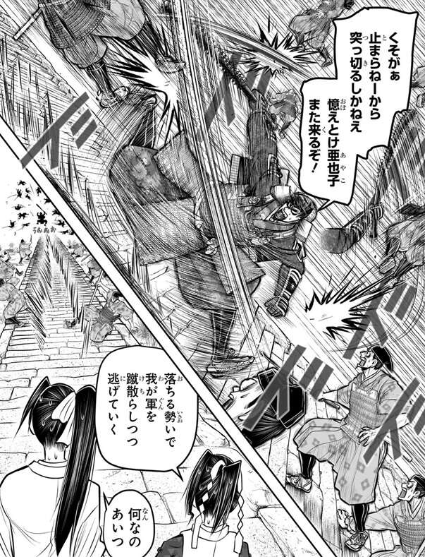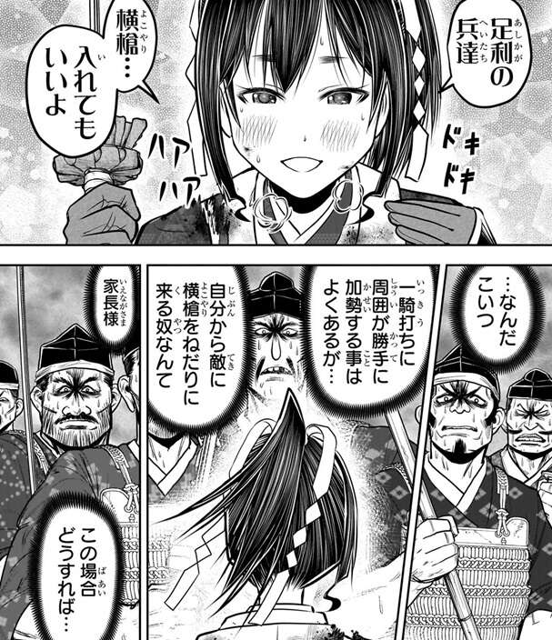 時行を先頭に正面階段から突撃してきた顕家軍に対して、斯波家長はまずは桃井忠常を突撃させて時行軍の隊列を乱そうとします。桃井は、俺の嫁になれ、と亜也子に求婚しながら突撃してきて、亜也子は顕家の援護射撃を受けながら桃井を撃退します。桃井は正面階段から転落しながらも時行軍を蹴散らしていき、結果的に時行軍の隊列は大きく乱れます。