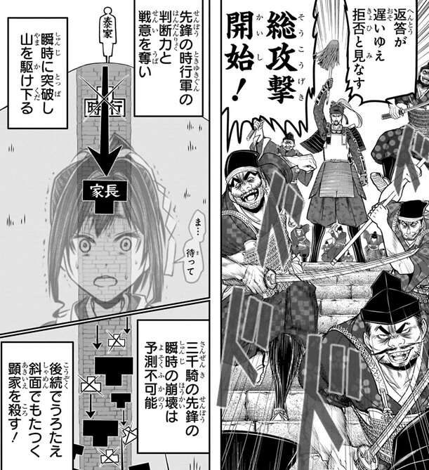 家長は北条泰家を人質として柱に吊るし、時行の動揺を誘います。家長は、北条泰家を助けたければ降伏せよ、と時行に迫りますが、時行はすぐに判断できず時行軍は立ち止まってしまいます。その機を逃さず家長は総攻撃を開始し、長尾景忠も投入して足利軍は一気に時行と顕家の首を狙います。