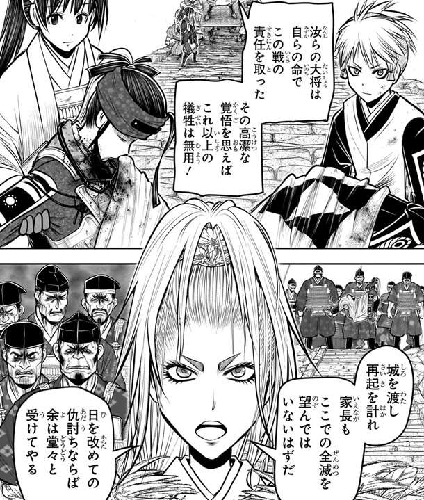 時行は家長の考えのさらに上を行き、敵軍の眼を使った技・千眼白刃(せんげんびゃくじん)を成功させて家長を見事、討ち取ります。総大将の斯波家長が戦死した後、足利軍は杉本寺を顕家軍に明け渡して撤退、顕家軍は杉本寺での攻城戦に勝利し、時行は鎌倉へ進軍します。