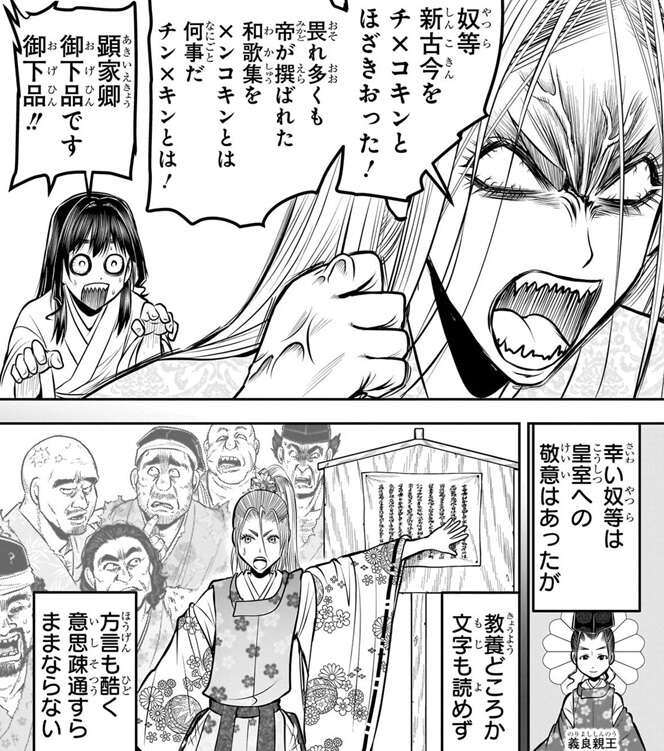顕家軍は京を目指して進軍しますが、関東足利党の残党の待ち伏せに遭い進軍速度が上がらず兵糧不足に陥っていました。仕方なく食料を現地調達しようとしますが、顕家軍の結城宗広は現地で大規模な略奪に及んでしまいます。略奪が大嫌いな時行は結城を止めようとしますが結城は時行に剣を向け、結城と時行は一瞬即発の状態になります。