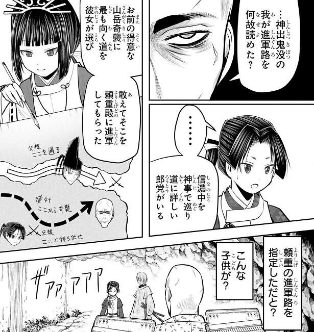 ついに北条時行は信濃で挙兵し、中先代の乱が始まります。しかし、肝心の北条時行は大鎧に鉄兜の完全武装では重すぎて全然動くことが出来ず、早くも諏訪頼重にギブアップします。この問題は動きやすさ重視・逃げ特化の軽量化された鎧に着替えることで解決し、北条時行は因縁の瘴奸に戦いを仕掛けることになります。瘴奸は頼重軍の背後を山中から襲い掛かろうとしていましたが、北条時行は瘴奸の軍に突っ込んで行きます。
