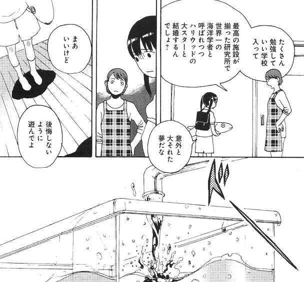 人魚が普通に存在している小さな町で、準は通学路の途中で倒れている人魚を見つけます。友人の浜に人魚をどうすればいいか携帯で相談しますが、人魚は金を持っていないので治療費の請求が来るから放っとけ、と言われます。しかし、人魚をそのままに出来ない準は救急車を呼び、救命士が海に浸けると元気になって人魚は海に逃げていきます。しかし後日、準が学校から帰宅していると、海岸線から道路の方に向かっている人魚を見つけます。
