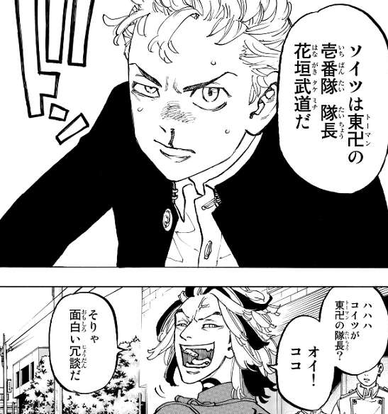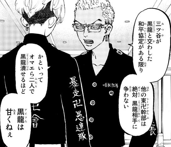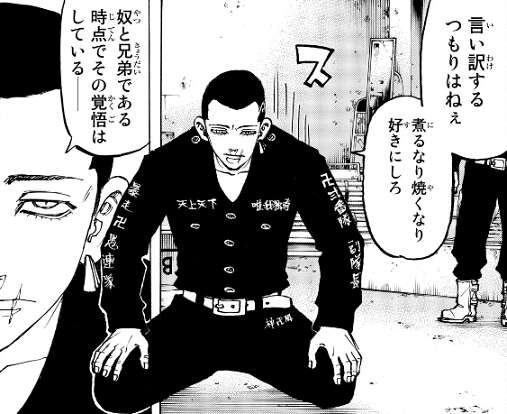 東卍では、武道が十代目黒龍の総長 大寿にボコられた事、また八戒が大寿の弟だった事が、問題となりマイキー達幹部会で話し合いが行われます。八戒が黒龍の総長の弟だったことから、黒龍の回し者だと疑われますが、言い訳はせず八戒は東卍をやめるとマイキーに宣言します。