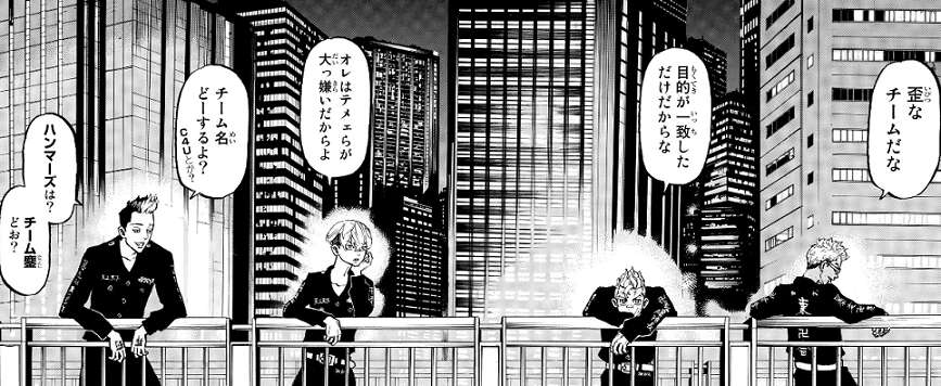 千冬は稀咲と組むことを嫌がりますが、武道は二度と皆の不幸な未来を見たくないというおもいを千冬にぶつけて、その為なら稀咲とでも組む、と決心を伝えます。武道のおもいに根負けし千冬も稀咲と組む事に同意します。そして、武道、千冬、半間、稀咲の四人で12月25日のクリスマスまでの短期チームを結成します。