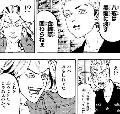 東卍離脱を願い出た八戒に三ツ谷は、大寿に会わせろ!と言います。八戒は大寿と会っても、話し合いでいい結果は生まれないと、三ツ谷に止めるように言いますが、三ツ谷は構わず自宅まで行って大寿に直接話し合いをします。そして大寿に直接、八戒を黒龍に渡すと言います。