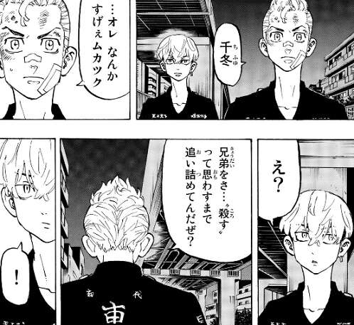 八戒から決意表明を聞いた武道は、兄弟をそこまで追い詰める大寿を許せないと、千冬に黒龍をぶっ潰す!と宣言します。千冬からはバカだな、言われるも武道の決意が変わらないと分かると、千冬も黒龍をぶっ潰す事に協力してくれます。マイキーと三ツ谷を除いた幹部をファミレスに呼んで、黒龍を潰す提案を武道と千冬でしますが反対されてしまいます。