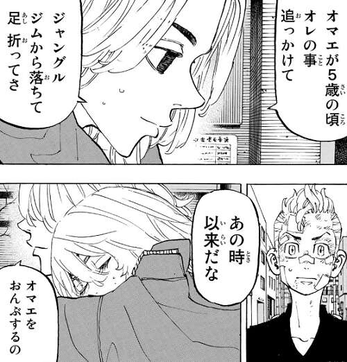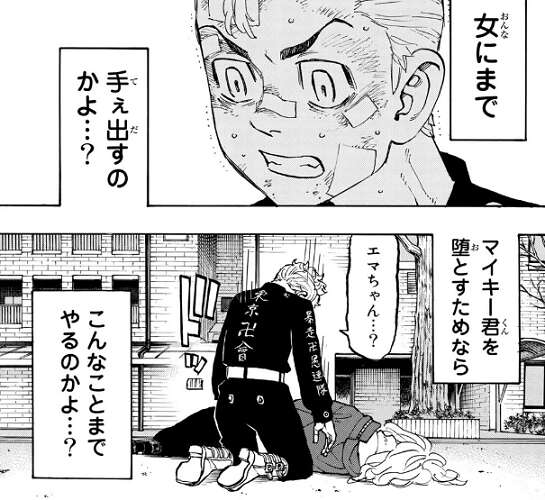 エマが襲われて倒れている場面を見たマイキーは呆然自失の状態で、稀咲が襲ってきた事を武道が伝えようとしますが、それを遮ってエマを背中にのせて病院まで連れて行きます。病院まで連れて行く最中に、昔の思い出話やドラケンとの事を話しながら、マイキーはエマを励まし続けます。