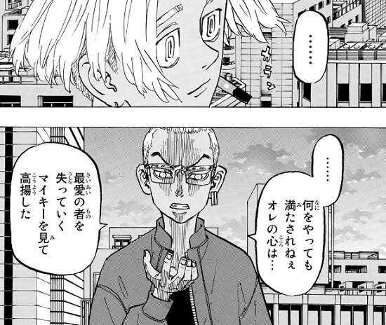 エマの死が受け入れられないマイキーとドラケンは天竺の抗争にも参加できず、東卍は天竺に乗り込めずにいます。一方、武道はマイキーにエマを殺したのは稀咲である事を伝え、自分一人でも天竺とやると宣言し、自分だけでも前に進もうとします。