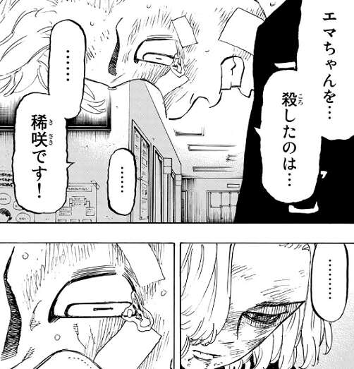 稀咲はエマを始末する為に、自分自らバットを握りバイクの後ろに乗り、エマを襲います。エマが稀咲に襲われて倒れている情景を見ながら、現代にエマがいなかった事、そして武道が何度未来を変えてもマイキーが結局は闇落ちしてしまい、変えらなかったのはエマが殺されてしまう事が原因だと直感します。