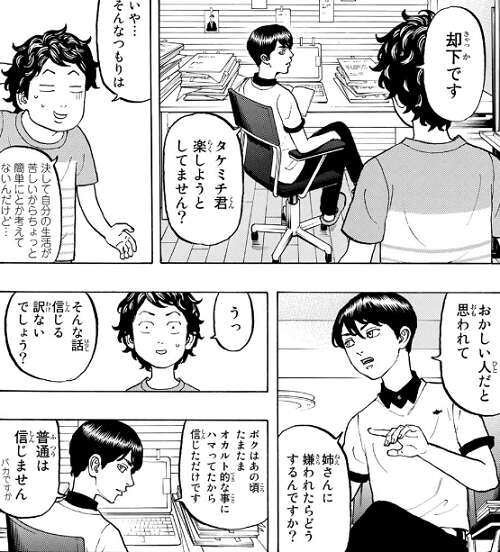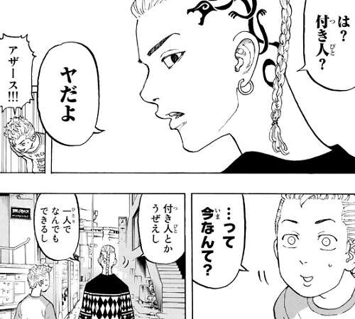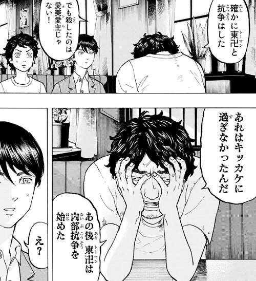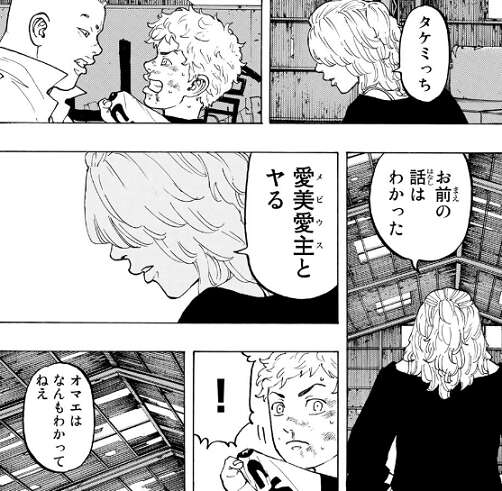 マイキー達四人が愛美愛主との抗争を話し合っている所に、直接愛美愛主との抗争を止めるよう武道は直談判しますが、マイキーから断られてしまいます。愛美愛主との抗争に反対する武道は、愛美愛主に親友をひどい目にあわされたパーちんから殴られますが、それでも反対の意思を曲げません。その武道の姿を見てドラケンは、少し愛美愛主を調べてみてもいいんじゃねーの?と言います。