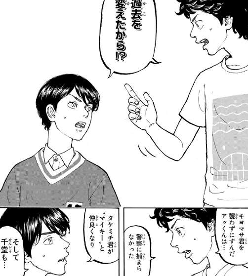 12年前から戻って来た武道は、直人からタイムリープの能力が、“12年前の同じ日に戻る”能力である事を教えてもらえます。さらに、千堂敦がキヨマサを刺して警察に捕まるという過去を変えたため、現代では末端のチンピラでなく東卍の幹部になっている事が判明します。武道は現代の千堂敦に会ってマイキーや稀咲の事を聞こうとします。