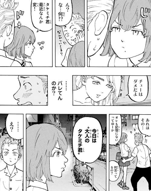 マイキーとドラケンに気に入られて東卍に誘われた武道は、マイキーが12年後に関係のないヒナを殺してしまうような東卍という組織のボスではないと確信します。何故マイキーが“悪い奴”になってしまったのか分からず、武道はそれ以上東卍の事は分からないまま、ヒナとの勉強会を楽しんでいました。