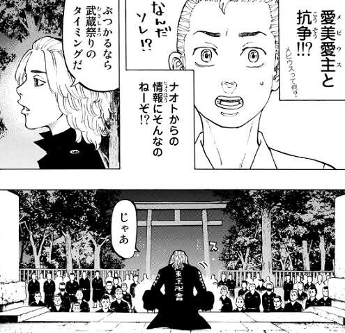 ドラケンが死ぬ原因を突き止めようと考えていた時、武道はドラケンから東卍の集会に呼ばれます。その集会で東卍が愛美愛主という暴走族と抗争を8月3日の武蔵祭りの日に始めると聞きますが、12年後の現代では愛美愛主を直人から知らされていなかった為、武道はどちらがドラケンの死ぬ原因なのか、混乱します。