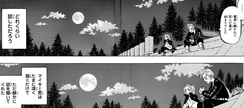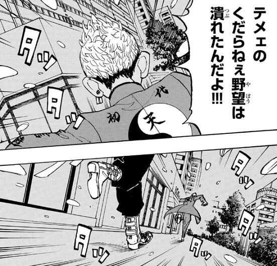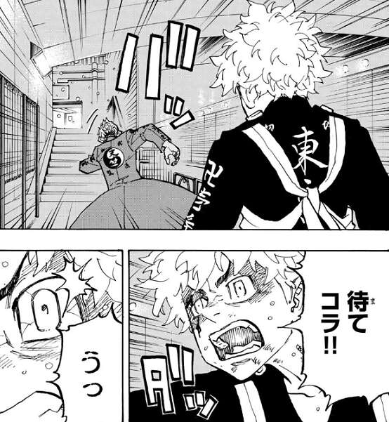 追い詰められた稀咲はバイクを捨てて走って逃亡し、武道は稀咲を追おうとしますが、撃たれて負傷した足のせいで走れません。その時、ドラケンが武道を背負って稀咲を追いかけます。武道とドラケンは、ドラケンがキヨマサに刺された時の事を話しながら稀咲を追っていると、半間が追いつき稀咲を追う邪魔をします。