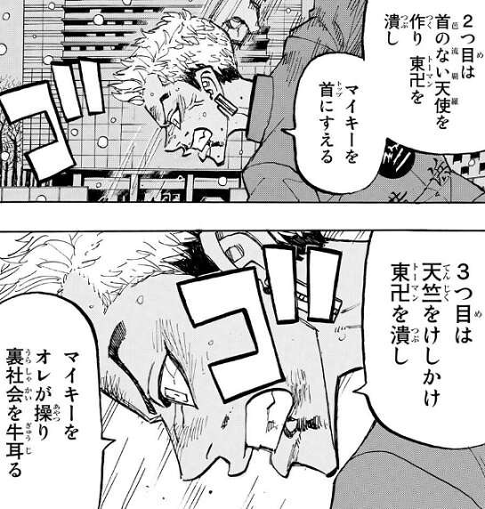 稀咲は子供の頃からヒナが好きだったこと、武道を子供の頃からずっとつけまわして見ていたこと、マイキーを操って自分が日本一の不良になる計画などを、武道に話します。そして、晴れて橘日向と添い遂げる事が目的だったと言い、武道が何度もタイムリープして邪魔した事に激怒します。