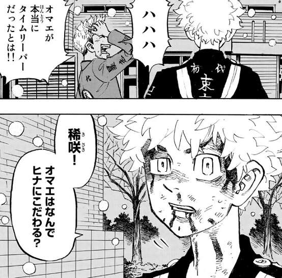 武道が未来でヒナが殺された話をするのを聞き、武道がタイムリーパーである事を言い当てます。そして武道は稀咲に、オマエはなんでヒナにこだわる?と、毎回未来でヒナを殺すか理由を聞きますが、その時稀咲がヒナに指輪を渡している光景が武道の脳裏に浮かんできます。