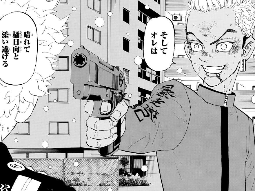 武道は稀咲に銃を向けて、銃で殺そうとしますが、その時ヒナとマイキーが現れて武道の名前を叫びます。武道は声に気をとられて、稀咲はその間に再び逃走を図ろうとします。武道は稀咲を追いかけながら、テメェのくだらねぇ野望は潰れたんだよ!!!と、叫びますが、ヒナはいつかオレのモノになる、と稀咲は言い諦めようとしません。