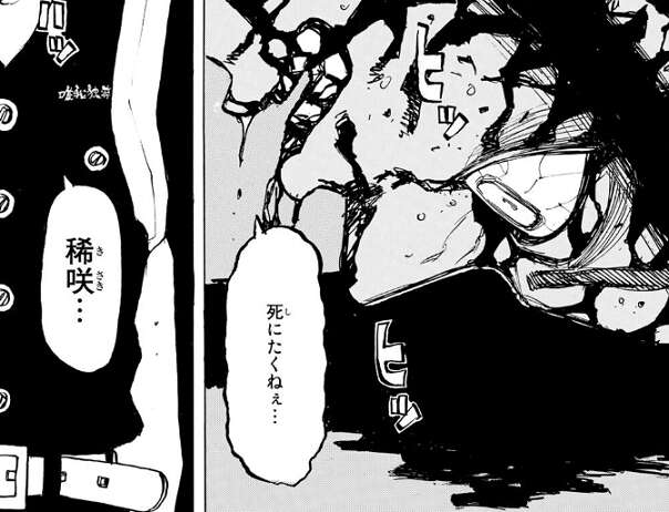 武道は稀咲に、もう二度とオマエを未来に帰すワケにはいかねぇんだよ!!!と、言った直後、稀咲は武道に何かを言いかけますが、突っ込んで来たトラックにはねられてしまいます。稀咲は一度は立ち上がろうとしますが、死にたくねぇ…、とつぶやいた後、稀咲はあっけなく死んでしまいます。
