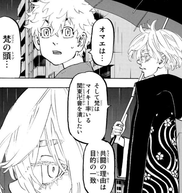 六波羅単代と梵(ブラフマン)が一瞬触発の状態でにらみ合っている時、武道は六波羅単代と梵(ブラフマン)の前で、関東卍會 総長・佐野万次郎をぶっ飛ばしたい!!と、宣言します。