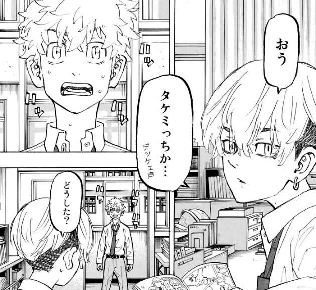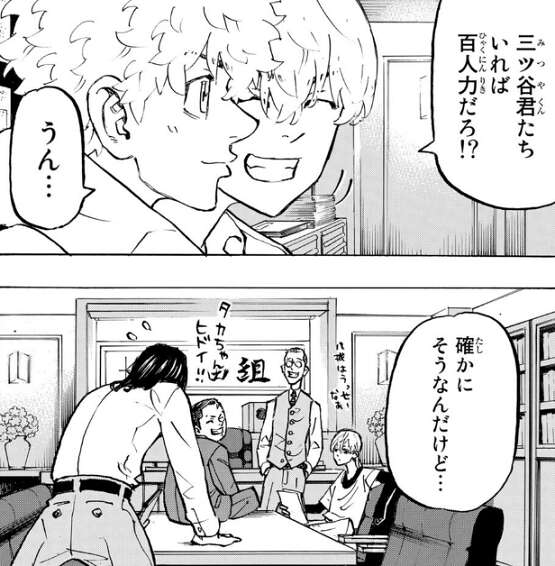 千冬から、まずは仲間集めだな!と、言われた武道は、八戒に誘われてパーちんのパーちんの事務所に行きます。そこで少し大人になったパーちん、ぺーやん、三ツ谷に会い、みんなが頑張っている姿を見て、自分がやろうとしてることに巻き込んじゃダメだと武道は考えます。