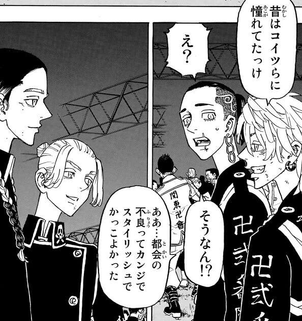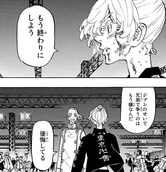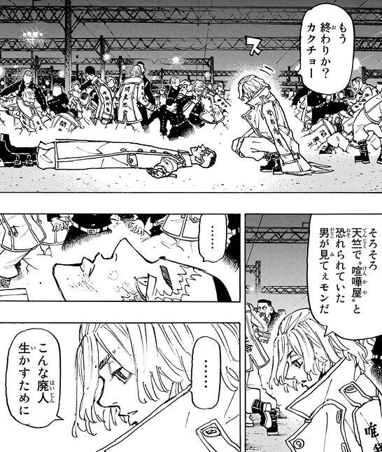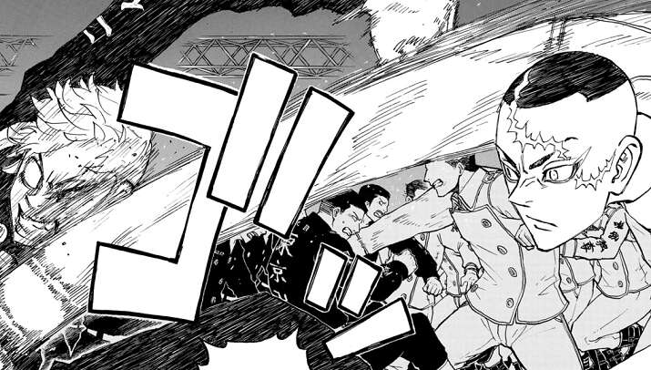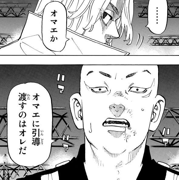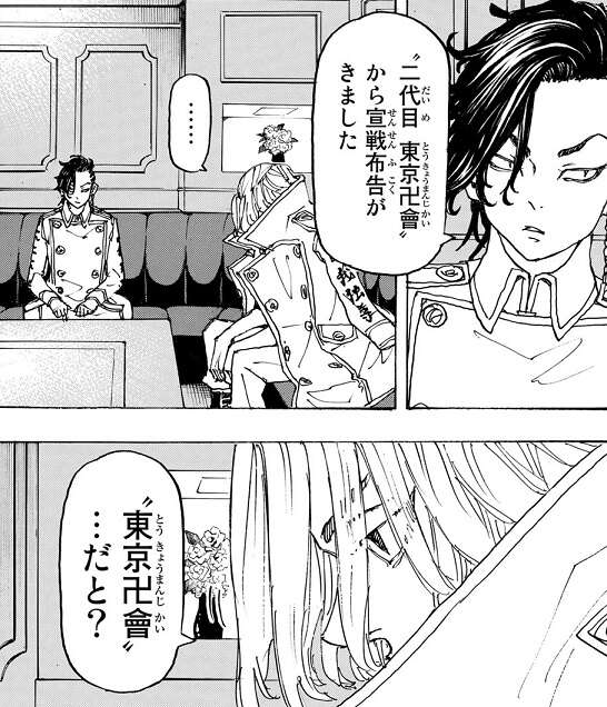 形勢が二代目 東京卍會から関東卍會に逆転する中、半間修二が三ツ谷、八戒、千冬、千堂の前に現れ、遊んでくれよ、と四人に話しかけます。一方、高みの見物をしていたマイキーの元に、パーちんが現れます。パーちんは、オマエに引導渡すのはオレだ、と言いマイキーにタイマンを挑みます。