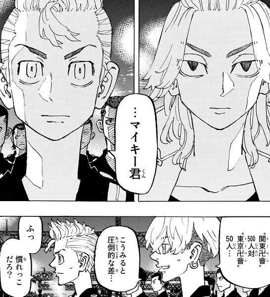 旧湾岸貨物ヤードには関東卍會と二代目 東京卍會のメンバーが集結しますが、関東卍會のメンバー500人に対して二代目 東京卍會のメンバーは50人と、人数的には圧倒的な差があります。マイキーは二つも“トーマン”はいらないと言い、関東卍會の三途春千夜は、二代目 東京卍會を負け組の集まり、関東卍會の相手にならないと煽ります。