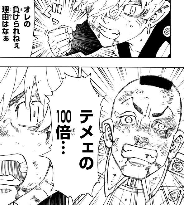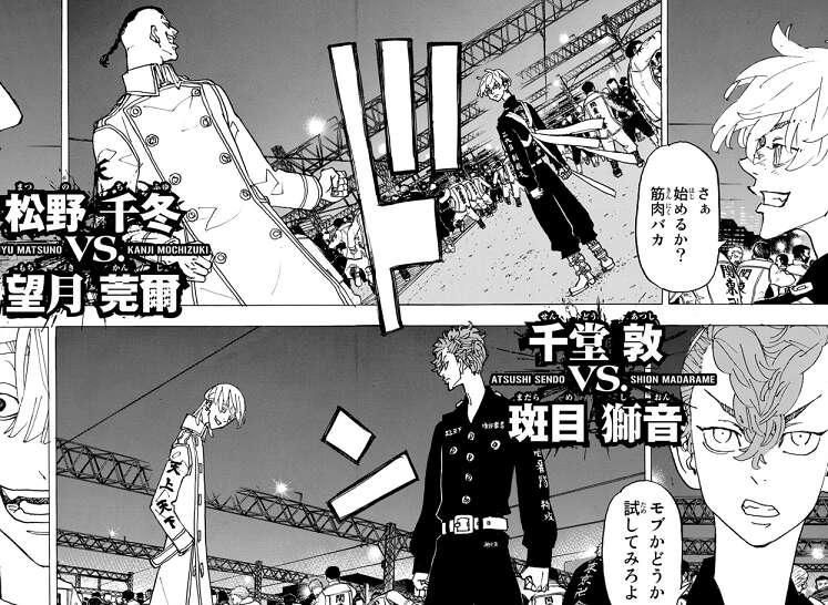 武道と鶴蝶と互角にやり合っているのを見て、千冬と千堂も負けていられないと、千冬は望月莞爾と、千堂は斑目獅音とそれぞれタイマンを張ります。そして三ツ谷は以前、不意打ちをくらい戦闘不能にさせられた灰谷兄弟と対峙します。