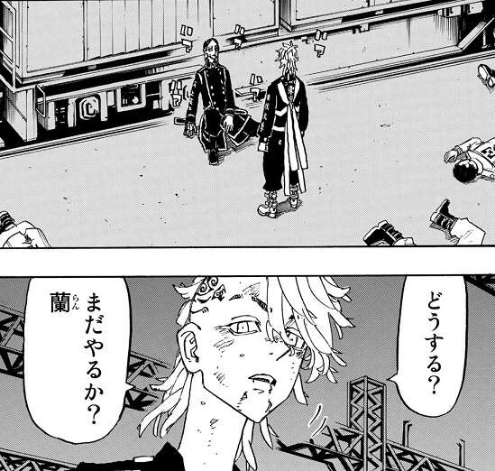 二代目 東京卍會の決起集会を行った武道は、関東卍會に対して宣戦布告を出します。関東卍會には梵(ブラフマン)にいたはずの今牛若狭と荒師慶三や、鶴蝶たち六破羅単代の元幹部、さらに半間修二までが、何故か関東卍會に合流していました。武道はヒナに本音を思いっきりぶつけた後、マイキーとの決着をつけるために最終決戦の場所、旧湾岸貨物ヤードに向かいます。