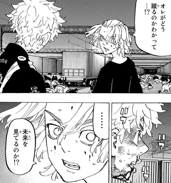 一瞬先の未来が見えるようになり、武道は進化した未来視(ビジョン)を使うことで、マイキーの攻撃を見切ることに成功します。武道は何度もマイキーの攻撃を見切ってかわす事で、マイキーの動揺を誘います。そして、ついに武道はマイキーに一発、パンチを入れてぶっ飛ばすことに成功します。