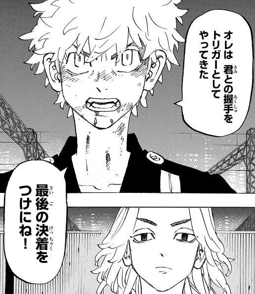 ついにマイキーと対峙した武道は、未来であった出来事をマイキーに話し、最後の決着をつけに来たことをマイキーに伝えます。その時、突然三途が大寿に刀で襲い掛かり、大寿は刀傷を負い倒れてしまいます。三途は武道がタイムリーパーであること知っていて、武道がマイキーの背負った業の深さを何も分かっていない、と叫びます。
