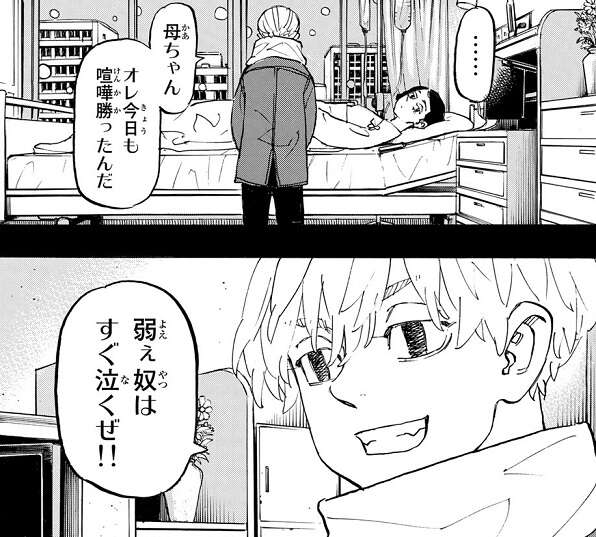 場面はマイキーが小学生の頃となり、マイキーは病気で入院していた母親に、弱ぇ奴はすぐ泣くぜ!!オレは泣かないよ、と言うと、オレが守るから帰ってきてよ、と母親に頼みます。しかしマイキーの願いも叶わず、マイキーの母親は3日後に病死してしまいます。マイキーは母親が病死しても、泣かないという約束を守ろうと、涙を流さないように我慢するようになります。そして、弱い奴やすぐ泣く奴を、極端に嫌うようになります。